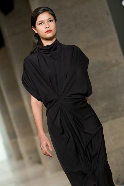 Aleksandar Protic has a very austere aesthetic in black and ashen with few nudes. The silhouette is always long and straight with no trappings unless some cut details and backless dresses. There are pants but they are all skinny to along the endless legs of the models in high heels. From shoes to top the silhouette is a sequel of voluptuous black in leather or rich fabrics. Everything in Protic's work epitomized the minimalism and colour is only allowed in the red lips of the models.
